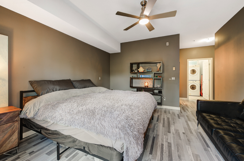 The living space is designed for ease and efficiency, with a comfortable sofa and an electric fireplace to provide a relaxed ambience. The convenience of in-suite laundry is a thoughtful addition to this multipurpose area.
