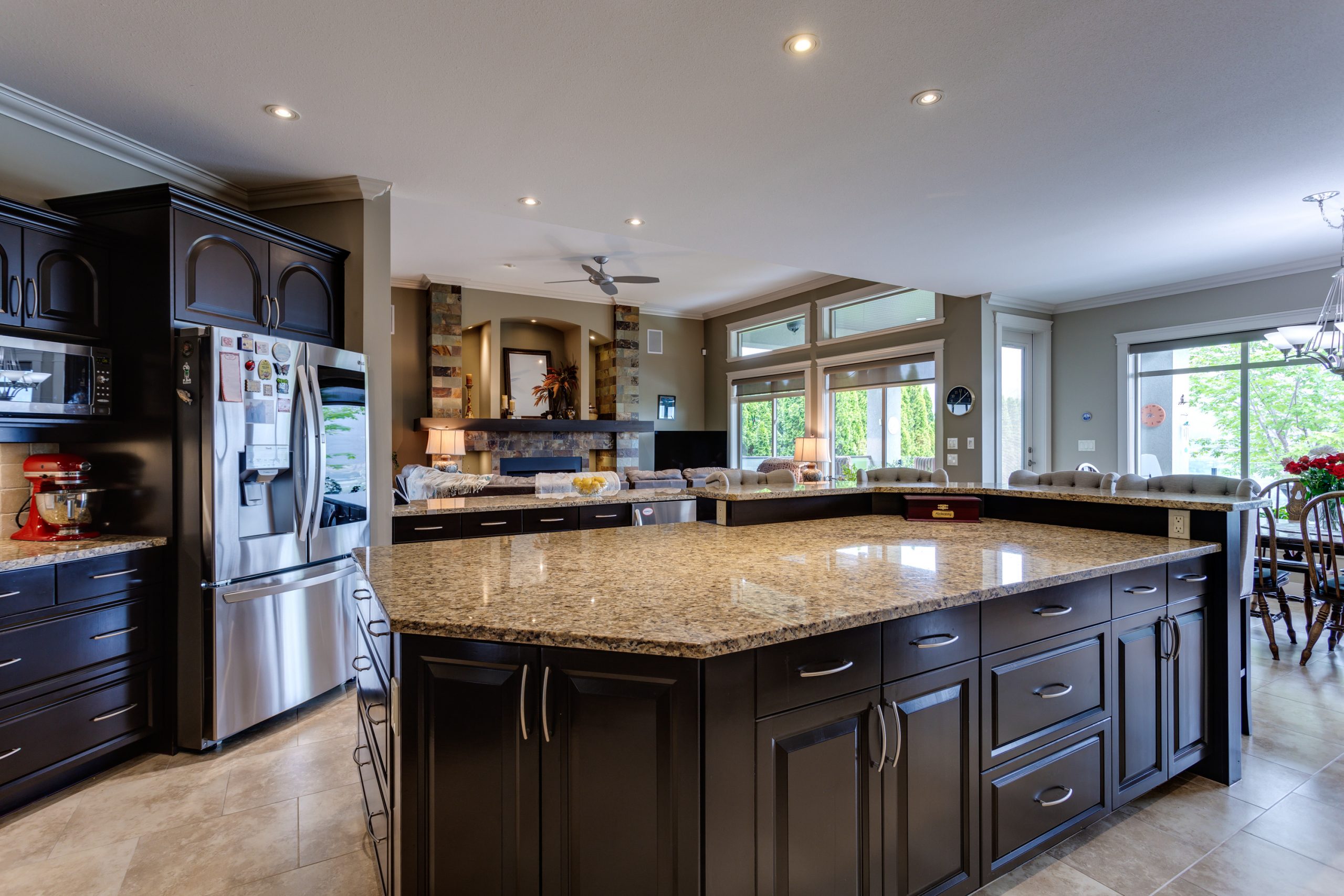 For the chef’s among you, the kitchen is a highlight, featuring extensive granite countertops and providing an ideal space for entertaining. The living room impresses with 9-foot ceilings and a striking 11.5-foot feature ceiling, creating an open and airy ambience.